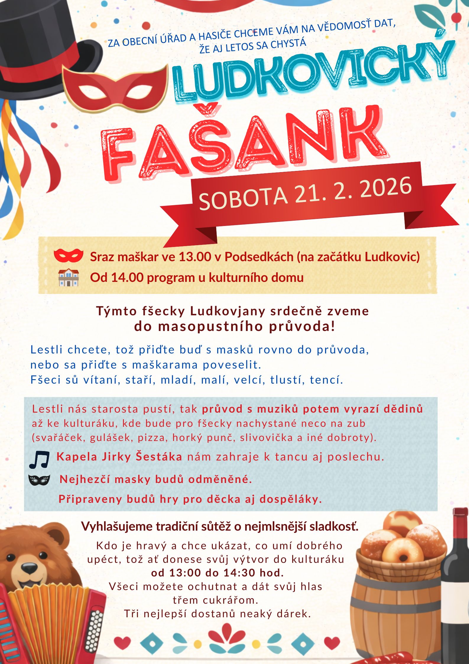 Přijďte si užít masopust do Ludkovic. Tento veselý svátek je spojen s tancem, hudbou a pestrými kostýmy. Všichni jsou zváni