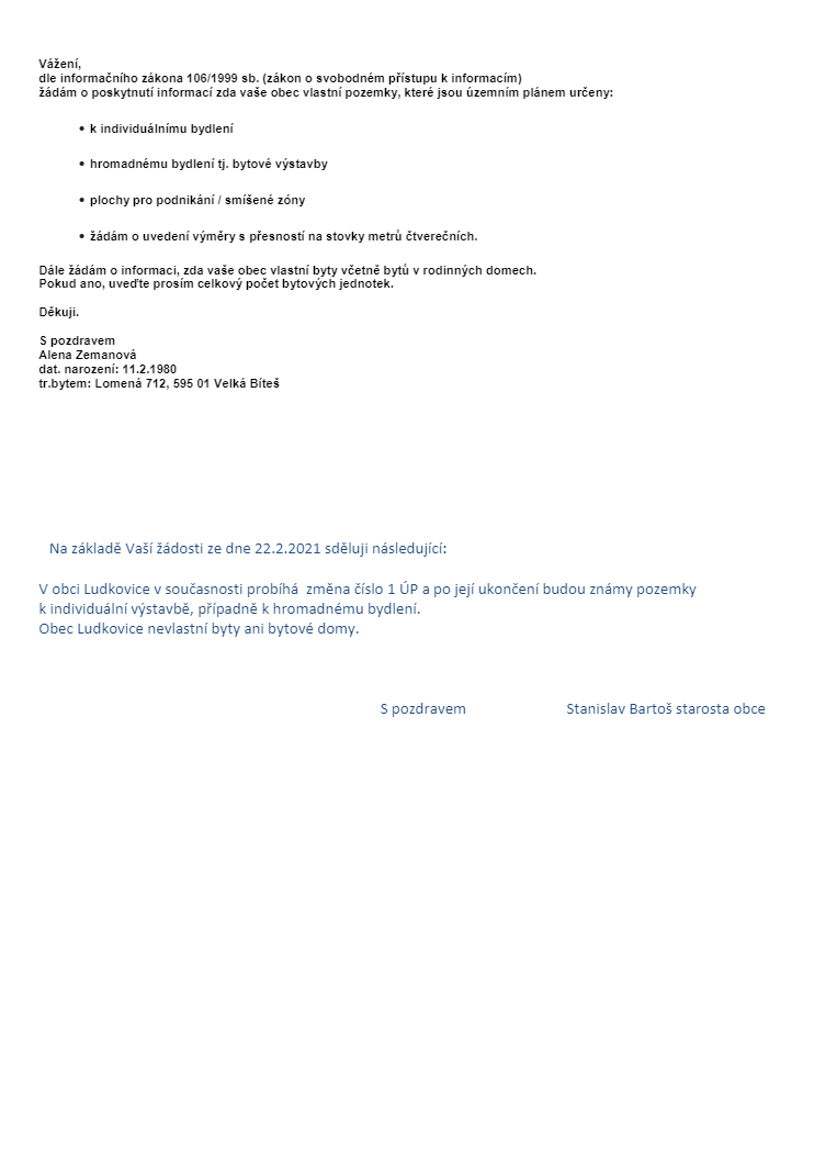 Žádost o poskytnutí informací – Alena Zemanová, Velká Bíteš